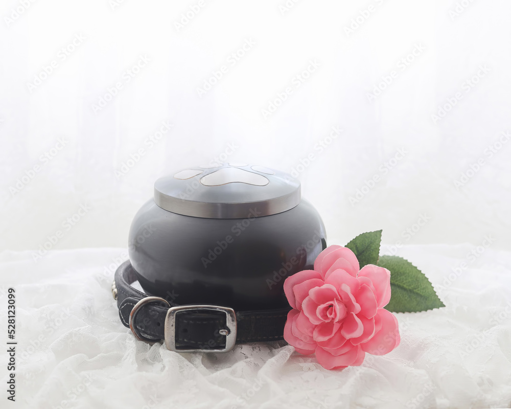 In remembrance of a pet. Pink rose beside an urn filled with ashes of a dog on a white background. #528123099