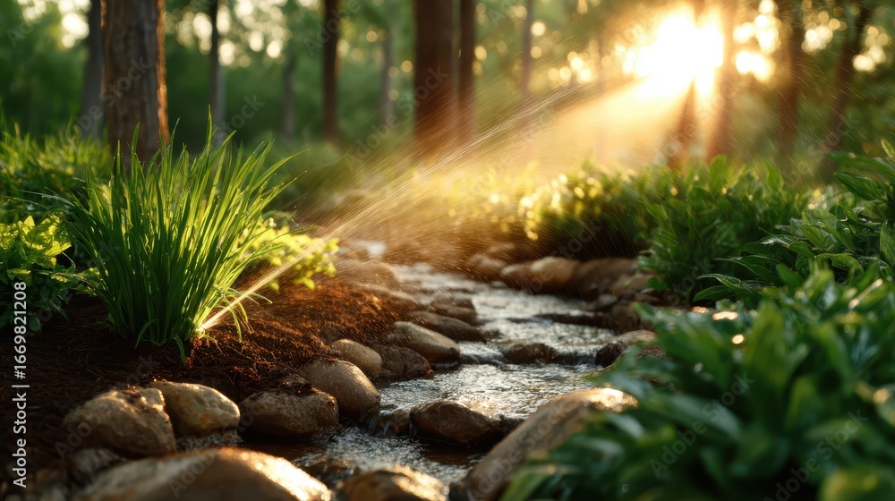 In this captivating image, sunlight filters through trees over a babbling stream, illustrating the beauty of nature and evoking a sense of peace and tranquility. #1669821208