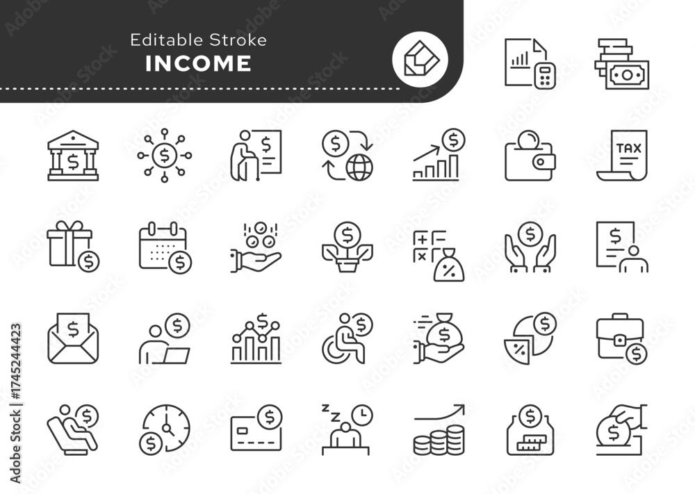 Income line icon set. Money, salary, payment, wages, pension, bonus, earnings, dividends, tax, accounting and more. Outline icon in linear style. Vector collection. #1745244423