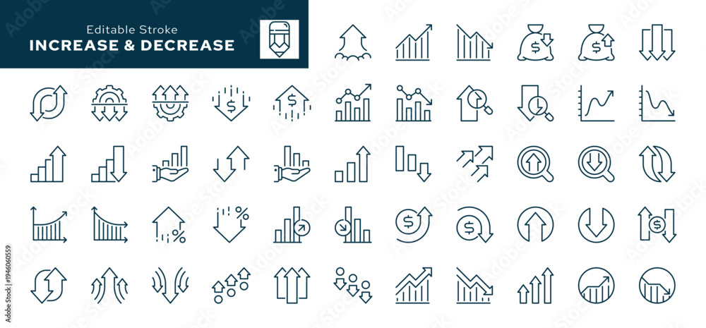 Increase and decrease. Set of outline icons. Profit, stock market, growth, fall, arrow up, down and more. Line icon in linear style. Vector collection #1946060559