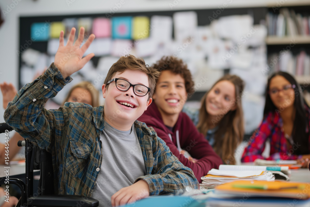incusive classroom with a kid with special needs in the center raising the hand #1546454849