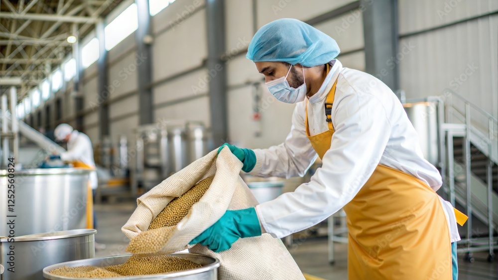 Indian Factory staff in Agro-Processing Plant Portrait – A worker handling grains, spices, or packaged food products in an agricultural processing unit. #1252560824