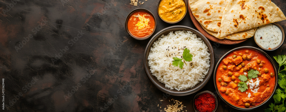 Indian food spread with various curries, rice, naan bread, and spices. Traditional cuisine for national festivals and celebratory meal concept. #1753629448