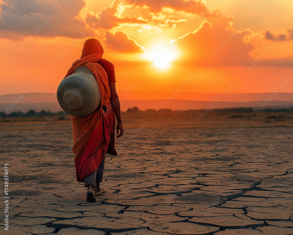 Indian Rajasthani woman walking in desert for water #1748374073