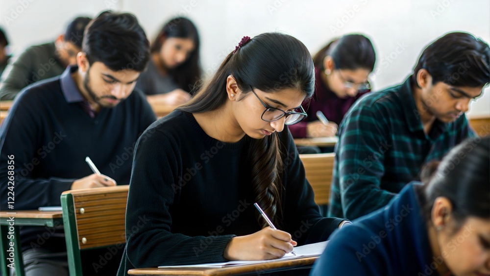 Indian students sitting in rows in an exam hall, concentrating on their papers, with a focus on the seriousness and discipline during examinations. #1224268856