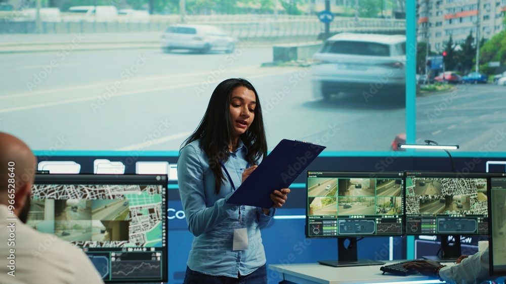 Indian supervisor leads her team to monitor the surveillance video footage and CCTV cameras to learn about urban traffic dynamics. Diverse people working on public safety. Camera A. #966528640