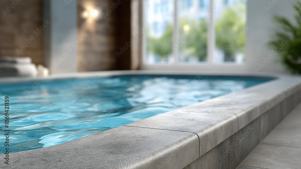 Indoor swimming pool with blue water and large windows luxury spa and fitness club interior #1869421159