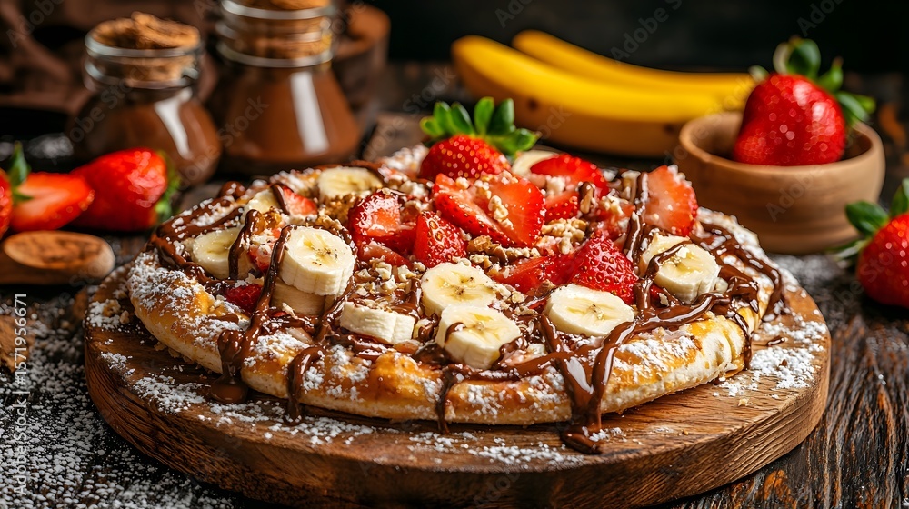 Indulgent homemade dessert pizza topped with a rich Nutella spread fresh sliced strawberries and bananas and a sweet crisp crust #1571956671