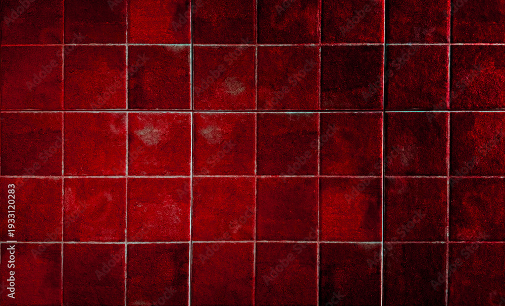 Industrial dark red textured ceramic square tiles wall background. Weathered rustic crimson grid tile pattern for interior design, bathroom, or kitchen backdrop. Gritty vintage stone surface. #1933120283