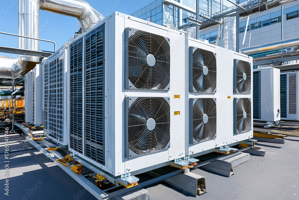 Industrial HVAC equipment on commercial rooftop. Concept of air conditioning technology, climate control and energy efficiency solutions. #1765641746