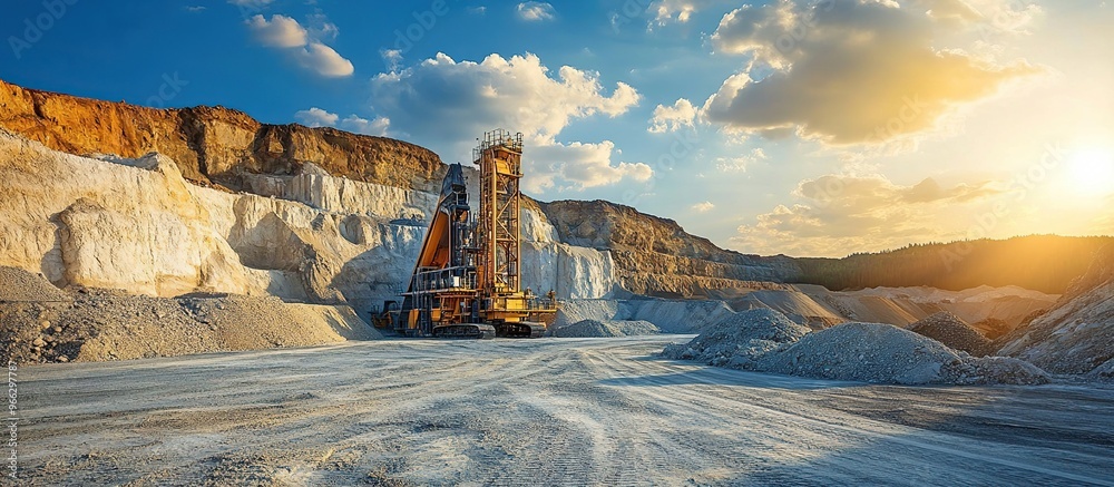 Industrial mining scene at sunset. Silica extraction and processing plant, with conveyor belt and massive shovels extracting silica sand #966297787