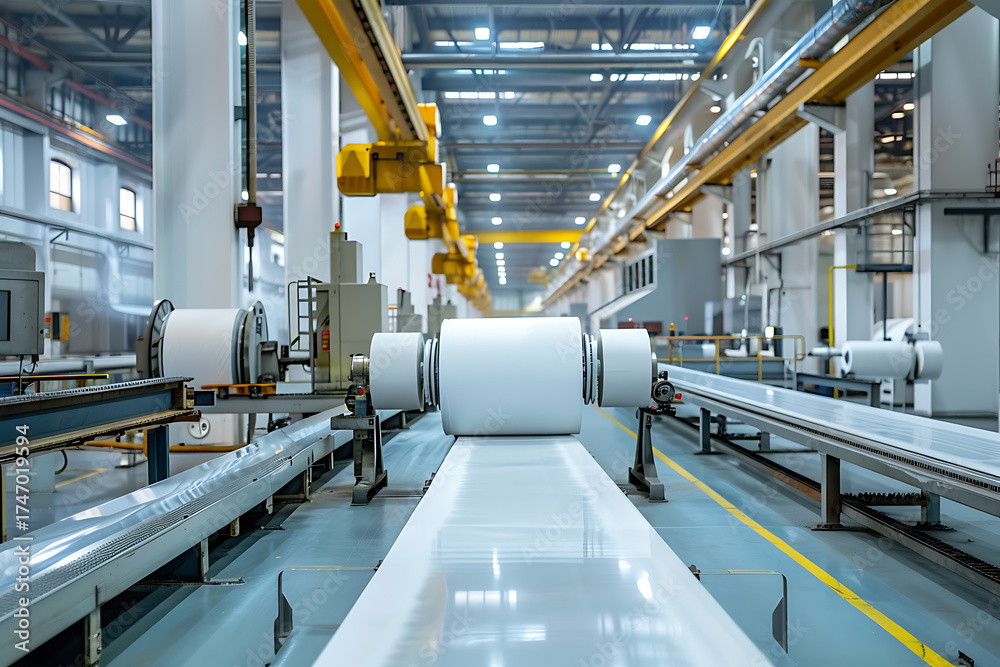 Industrial paper converting machine producing jumbo toilet paper rolls in modern factory #1747019594