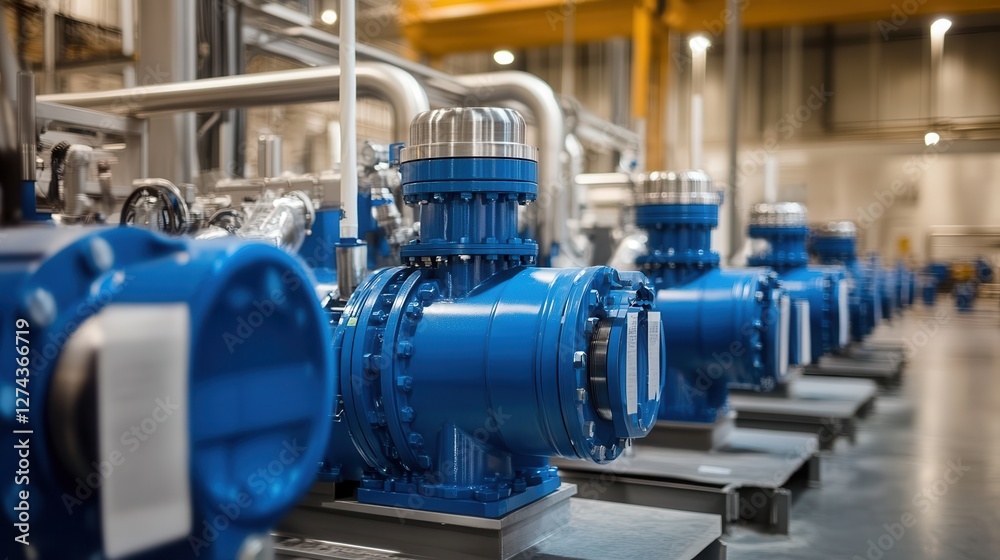 Industrial pumps in a manufacturing facility with blue hydraulic systems and piping, showcasing modern engineering and efficiency in production processes. #1274366719