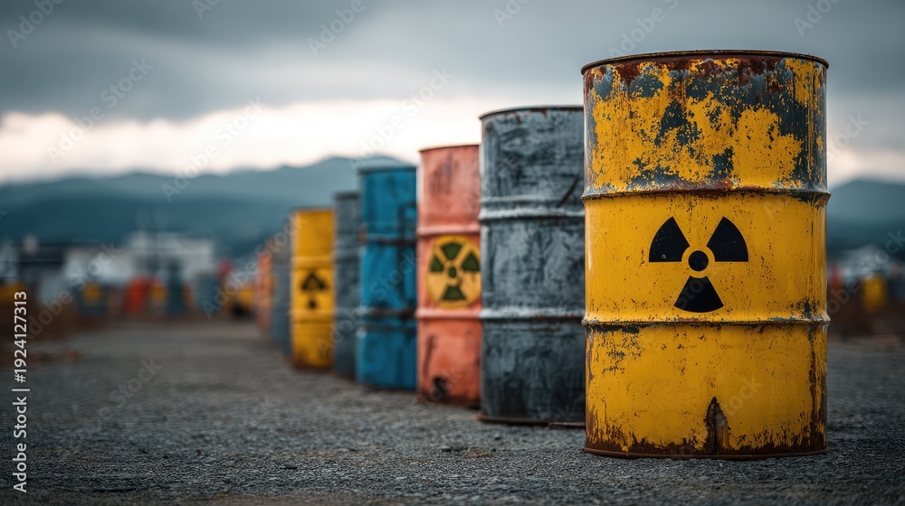 Industrial scene featuring colorful barrels marked with radioactive symbols, positioned in a desolate landscape under a dramatic sky, conveying themes of caution and environmental concern. #1924127313