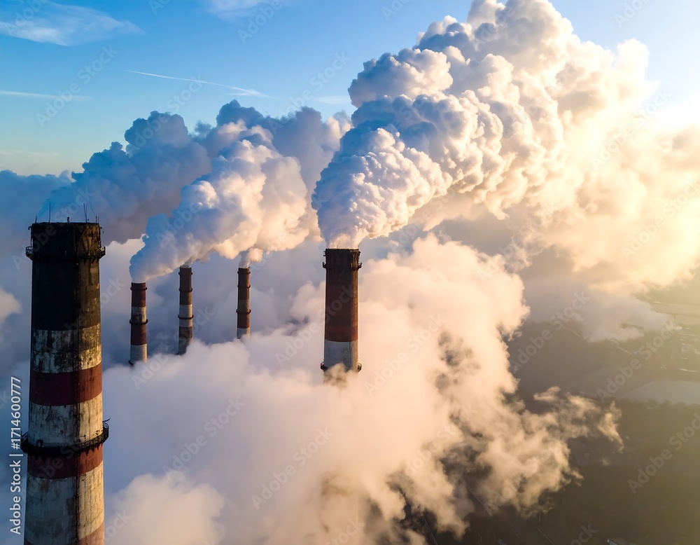 Industrial smokestacks emitting dense plumes against a sunrise sky #1714600777