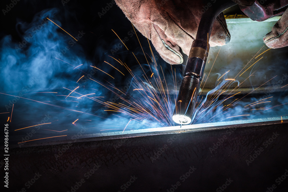Industrial welder welding fabricated construction in factory, Welding process by Flux Core Welding, FCAW #249866716