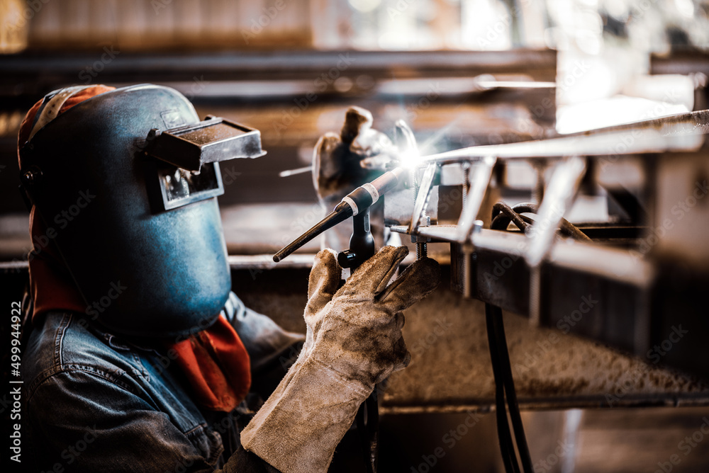 Industrial welder welding fabricated stainless construction work in factory, Welding process by Gas Tungsten Arc Welding - GTAW. #499944922