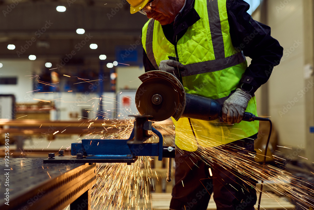 Industrial Worker Grinding Metal With Angle Grinder Wearing Safety Vest And Helmet In Factory #1925369875