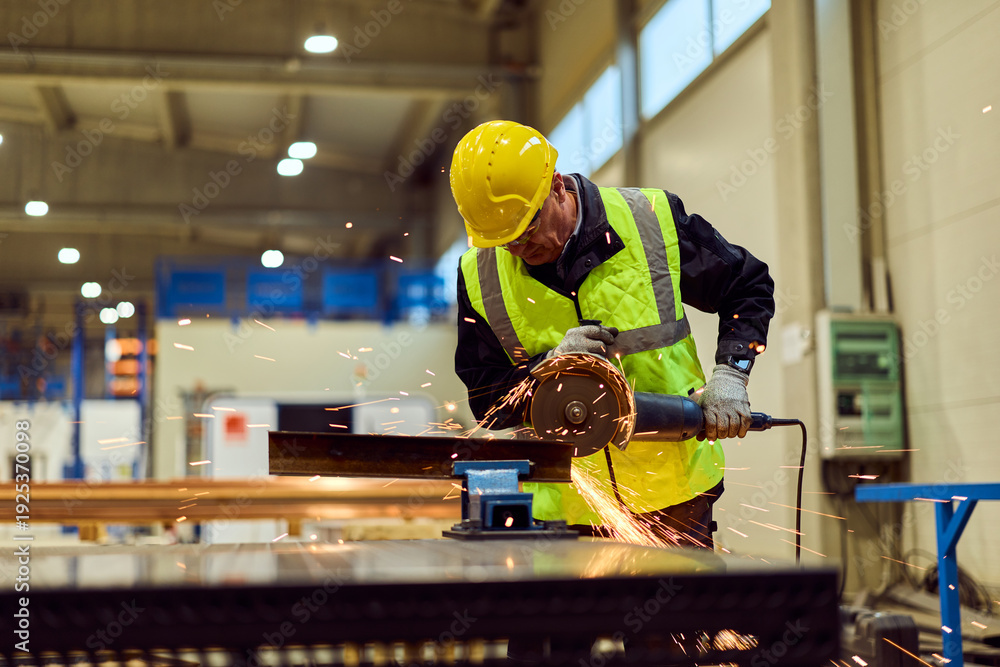 Industrial Worker Grinding Steel in Warehouse Factory Wearing Safety Helmet and High-Visibility Vest #1925370098