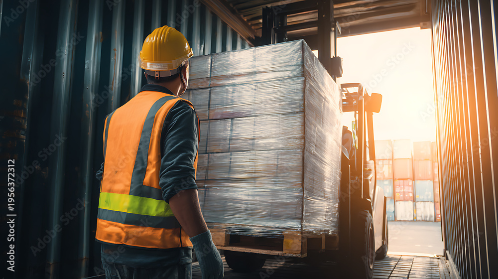 Industrial worker in protective gear observes forklift operate inside shipping container, loading palletized goods for global logistics and transport #1956372312