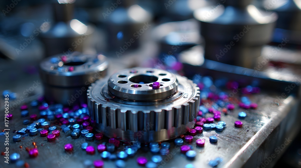 Industrieradzahnrad mit bunten Partikeln auf Metalloberfläche – abstrakte Makrofotografie #1779062985
