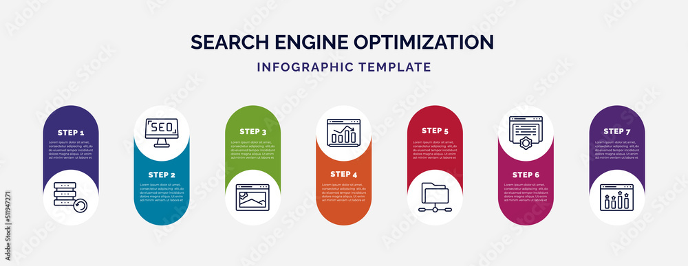 infographic template with icons and 7 options or steps. infographic for search engine optimization concept. included backup, screen, image, graphic, shared folder, content, ranking icons. #511947271