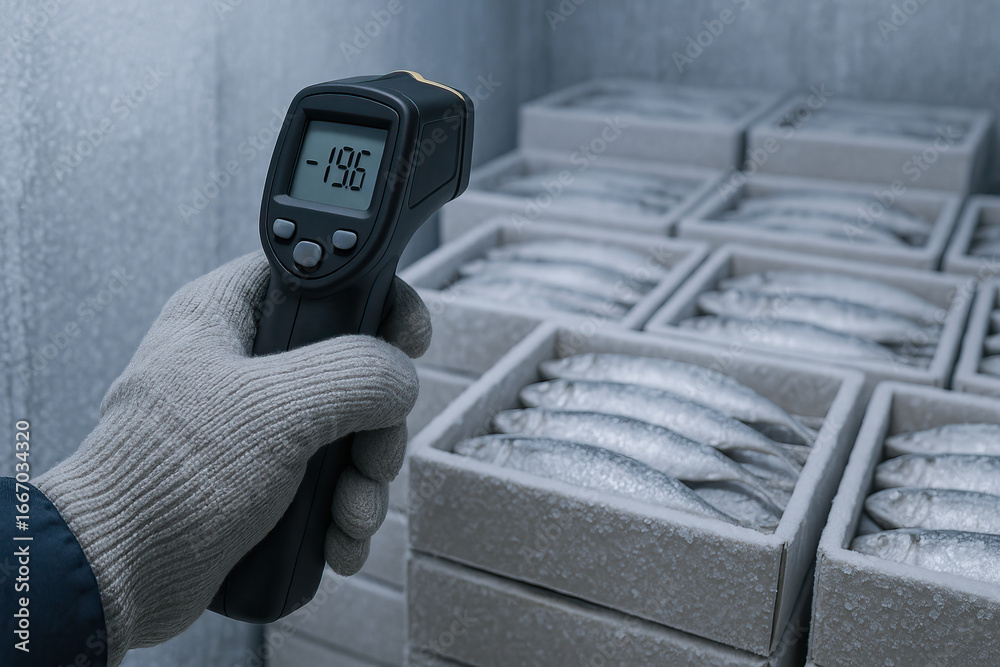 Infrared thermometer measuring cold temperature of frozen fish in storage boxes, gloved hand holding device in cold environment #1667034320