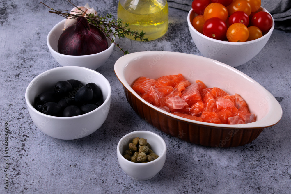 Ingredients for Mediterranean-style fish. Raw trout fillet, olives, cherry tomatoes, red onion, herbs, capers, garlic, and olive oil on a gray table. Step by step #1948484638