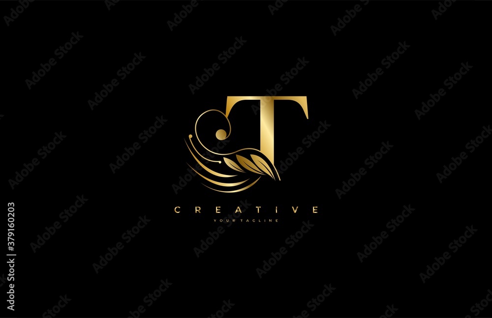 Initial T letter luxury beauty flourishes ornament golden monogram logo #379160203