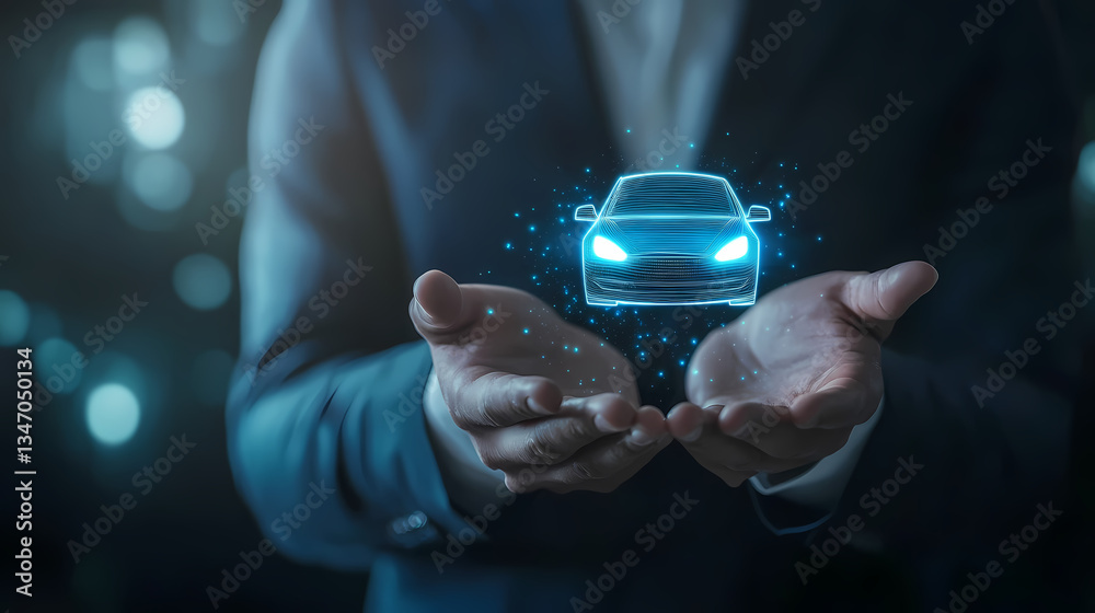 Innovative Car Technology: A person's hands cradling a digital car, showcasing the fusion of technology and automotive industry. #1347050134