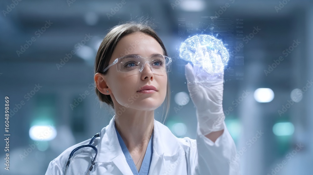 Innovative medical research action laboratory image of scientist with holographic brain clinical environment close-up technology concept #1604898869