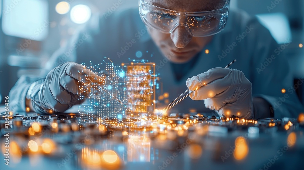 Innovative research action in technology lab electronics development close-up focus futuristic environment #1537061406