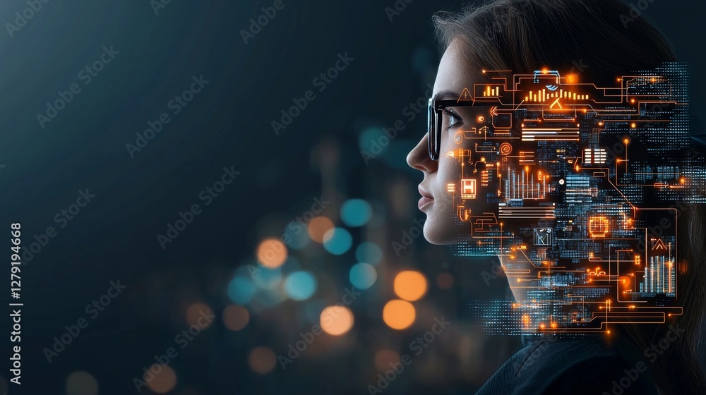 Innovative technology integration futuristic environment digital portrait urban landscape side view artificial intelligence and human connection #1279194668