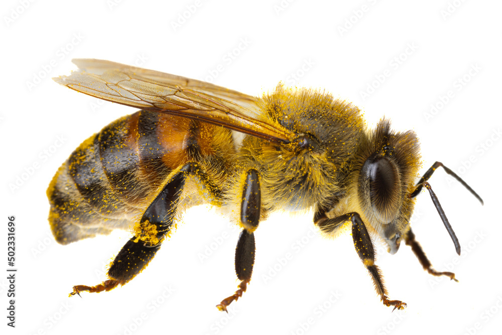 insects of europe - bees: side view macro of european honey bee ( Apis mellifera) isolated on white background abdomen details #502331696