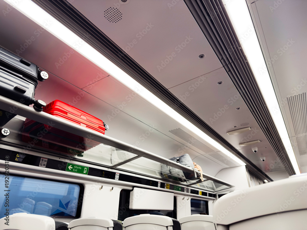 Inside a modern train car with overhead luggage and bright lighting, passengers seated and ready to travel #1920208118