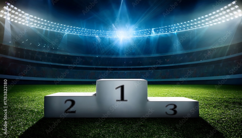 Inside the stadium's winner's stand, there is a soccer podium on grass. #1783822180