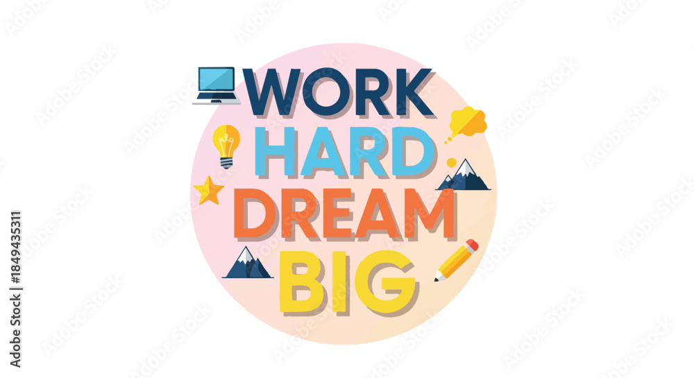 Inspirational artwork promoting dedication and ambitious vision, featuring 'Work Hard Dream Big' text with symbols of effort, ideas, achievement, #1849435311