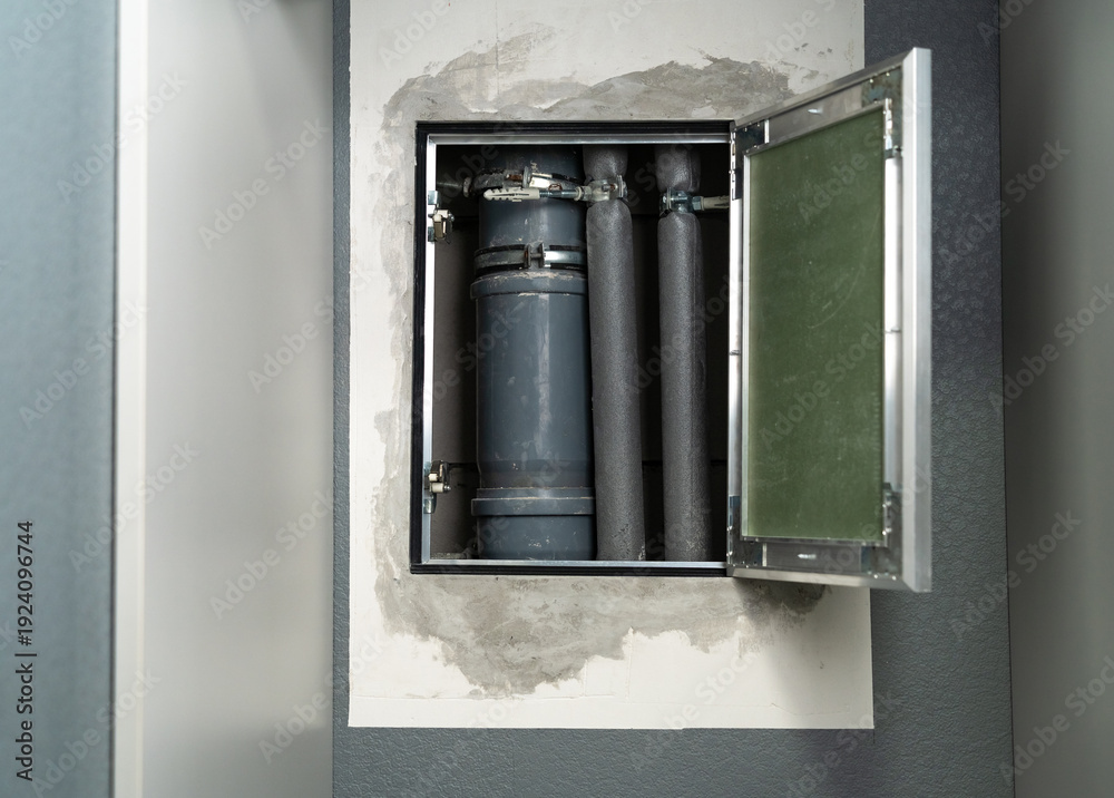Installation hidden technical inspection hatch in wall to access sewer pipes in kitchen or bathroom. Sewerage. Revisory access hole #1924096744