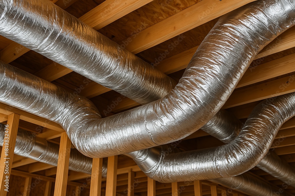 Insulated hvac ducts installed within wooden framework of a building interior during construction process. concept of efficient ventilation, energy saving, modern infrastructure #1819832476