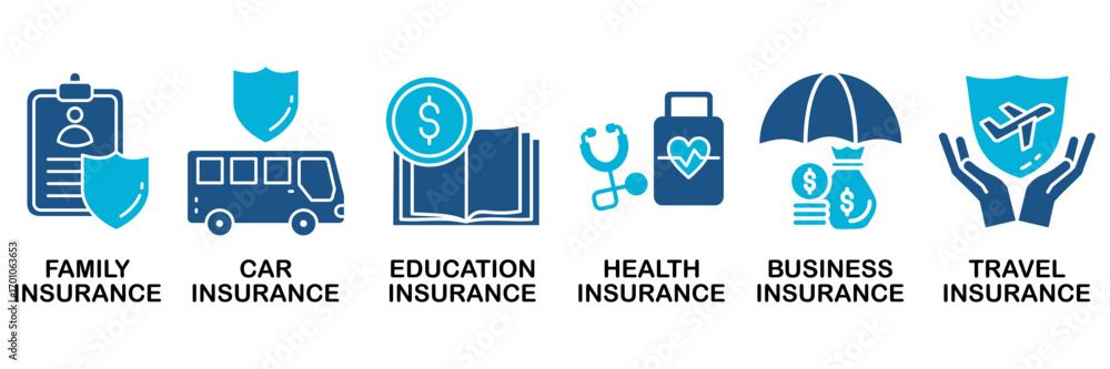 Insurance services icon set In Blue Monochrome Flat Design, Vector Illustration concept relate to icon of family, car, education, health, business, and travel insurance #1701063653