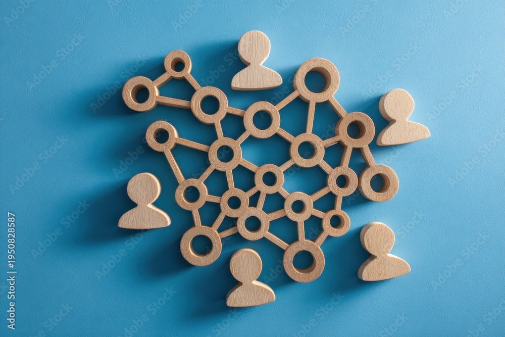 Interconnected Network of Ideas: A network of wooden figurines, intricately linked, symbolizing collaboration, connections, and the dynamic flow of ideas within a collective. #1950828587