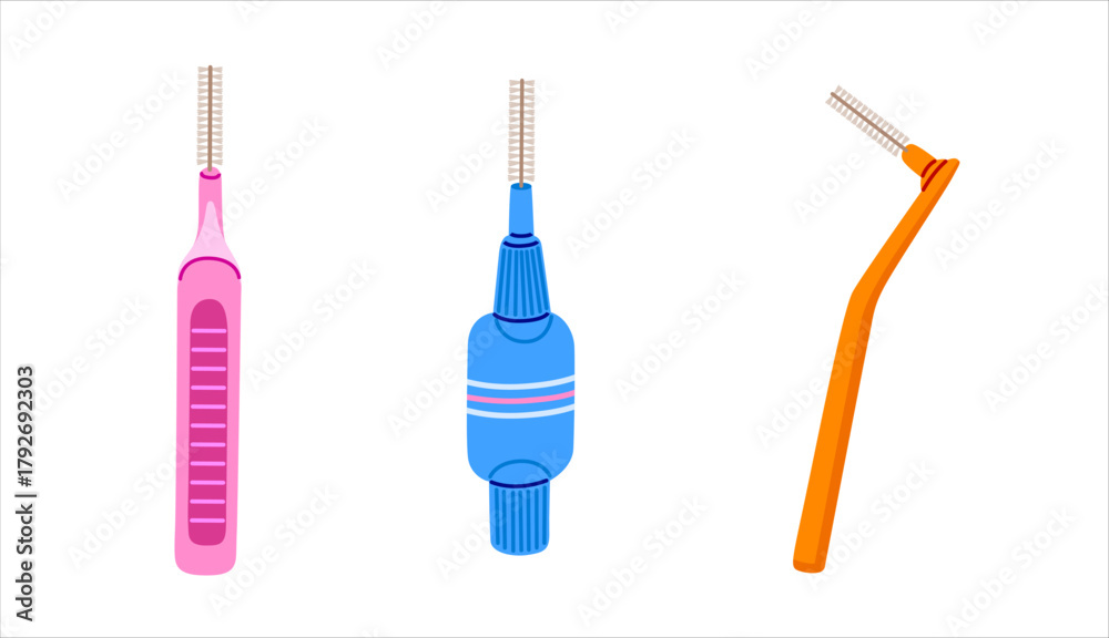 Interdental brush for cleaning teeth gaps. Oral care and dental hygiene tool. Hand drawn vector illustration. #1792692303