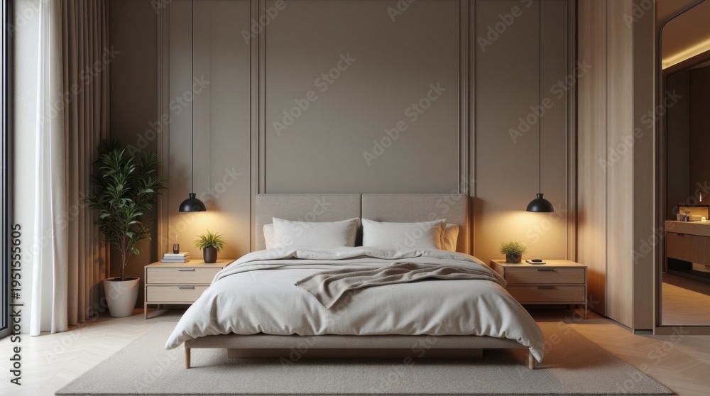 Interior de dormitorio moderno con una cama de plataforma de perfil bajo y ropa de cama de lino impecable #1951555605