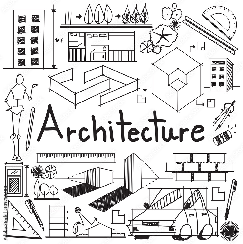 Interior design and building blueprint profession and education handwriting doodle tool sign and symbol in white isolated background paper for subject or presentation title, create by vector #109756680