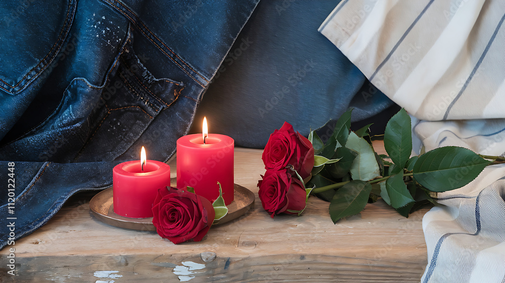 interior design mockup Two red candles and three red roses on a wooden background Faded Denim Indigo soft blue offwhite gray Art Brut Raw Art #1120122448