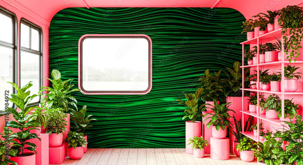 Interior of a retro concept car or van with many green houseplants in pink pots. Modern home decor for urban green living. #1766984972
