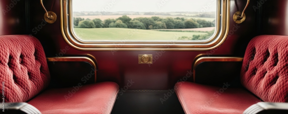 Interior view of a vintage train carriage with plush seating. #1075155415