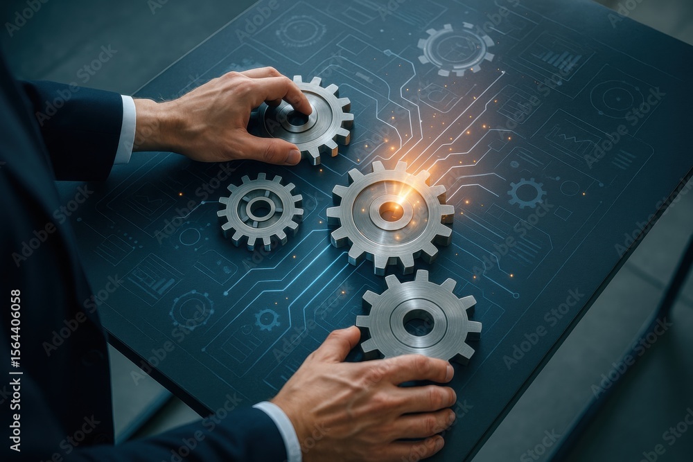 Interlocking Gears: A close-up of a business person's hands delicately arranging precision-engineered gears, highlighting interconnected processes, cooperation and collaborative strategies. #1564406058