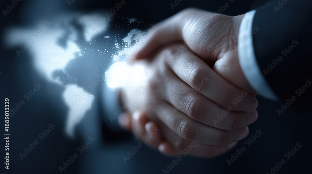 International business partnership handshake with digital world map overlay, mixed media style #1889013329
