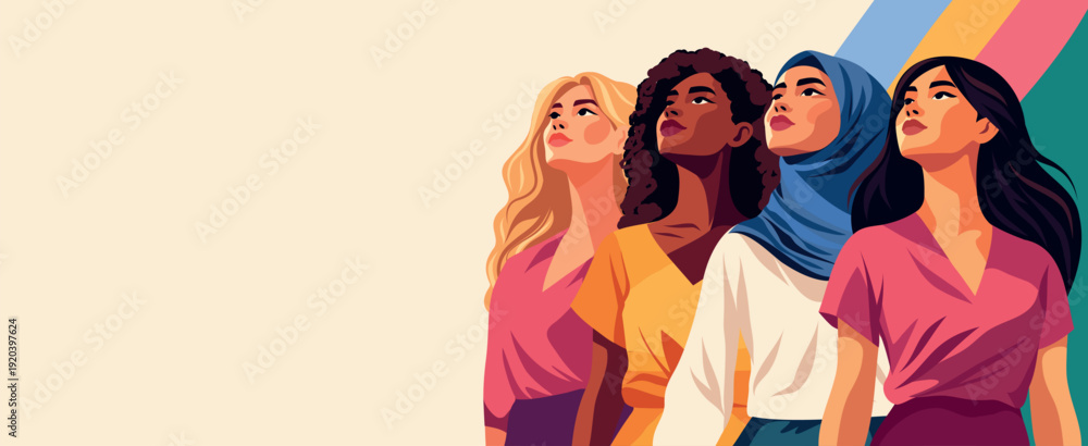 International Women's Day. March 8. Vector banner women of different cultures, nationalities standing together, look up confidently. Symbol unity, equality, diversity, empowerment. For women's project #1920397624